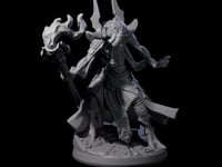 Introducing the Bony Mind Flayer, a captivating addition to your tabletop role-playing game collection. This miniature stands out with its intricate design, featuring a humanoid form that seamlessly blends with squid-like features. The figure's narrow, elongated head is adorned with skeletal ridges, resembling a crown, while its robes drape elegantly, enhancing its eldritch aura. A staff, topped with a twisted flame design, hints at its powerful magical or psychic abilities, making it a must-have for any collector.