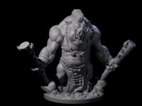 Standing in a menacing combat stance, this muscular boarman brute grips twin war clubs with devastating intent. His snarling tusked maw and powerful frame speak to countless battles won through sheer ferocity. Crude leather straps and tribal ornaments adorn his hulking form, marking him as a seasoned warrior of the wild clans.