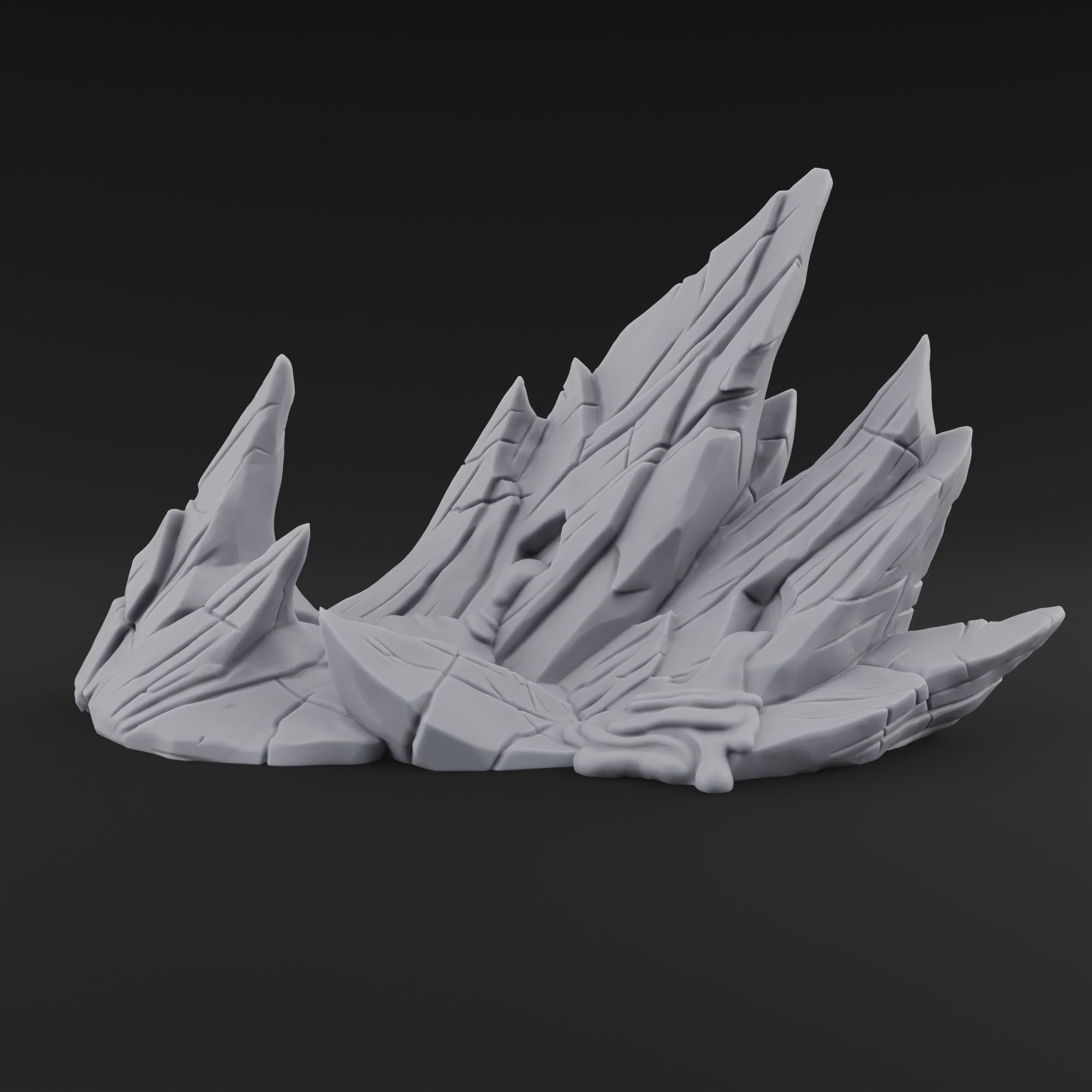 Sharp, angular spires of cooled magma thrust upward from a cracked and buckled base, frozen mid-eruption in brutal detail. Spanning 11.2 cm wide and rising 6.1 cm at its tallest razor-edged peak, this volcanic outcrop commands attention with its layered fracture lines, molten folds, and aggressive silhouette. Every surface tells a story of extreme heat and violent geology — deep fissures split the stone, while smooth rivulets of hardened lava pool between the jutting formations. 3D printed in high-detail resin, it arrives as a single piece ready for your paintbrush.