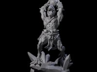 This detailed Troglodyte miniature captures a muscular humanoid figure in an imposing ritual stance, arms raised skyward while firmly gripping a ceremonial object. The figure's powerful physique is accentuated by minimal, tattered wrappings and a prominent ritual necklace. Set upon a detailed base featuring rocky terrain and sculptured foliage, this cultist's fierce expression and dynamic pose make it perfect for underground encounters, tribal ceremonies, or as a threatening adversary in any tabletop RPG scenario.