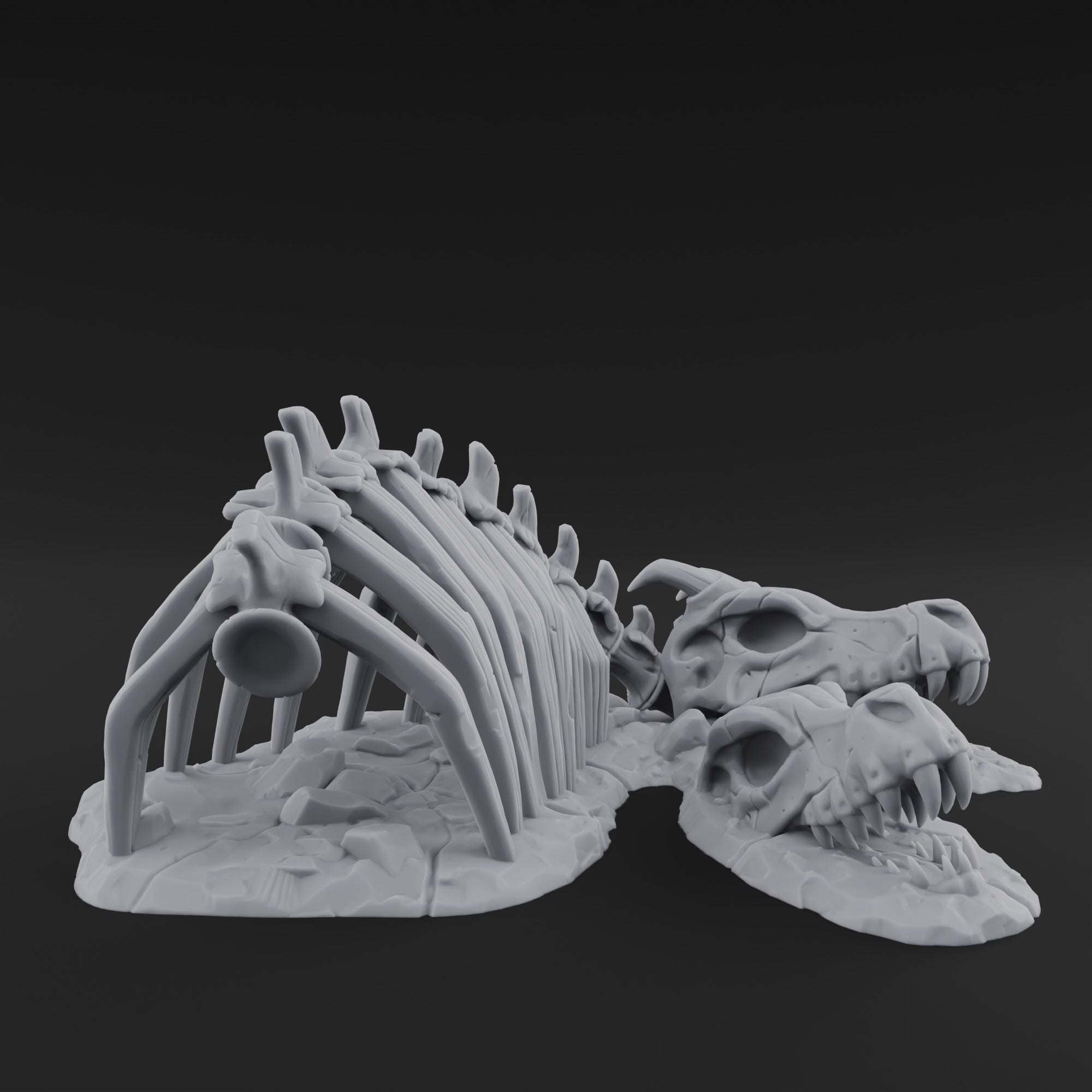 Bleached ribs arch skyward from shattered stone, curving over a hollow cavity large enough to shelter a crouching adventurer. The massive skull rests half-buried at the front, jaws frozen in a final snarl, every fang and cracked bone plate rendered in stunning detail. At 12.6 cm wide and 5.2 cm tall, this dragon skeleton commands immediate attention on any tabletop — a weathered monument to a beast that once terrorised the land. 3D printed as a single solid piece, it arrives unpainted and ready for your brush.