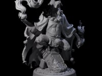 This masterfully detailed humanoid miniature captures a Hazodee elder in a moment of spellcasting prowess. The muscular figure stands in a dominant stance, one foot elevated on sculpted terrain, while wielding swirling magical effects in an upraised hand. Intricate details include a decorative necklace, flowing cloak, and traditional loincloth that speak to both status and heritage. The circular base features ornamental elements and scattered debris, providing depth and narrative context for this powerful spellcaster.