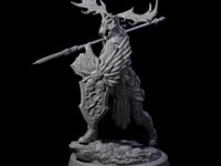 The miniature captures the grace and martial prowess of elven heritage through its ornate armor, featuring distinctive spiked and feather-like detailing that marks their status as a forest sentinel. The decorated shield and prominent antler crown emphasize their connection to nature, while the figure's extended arm and overhead spear position suggest imminent action. Set upon a detailed base with intricate terrain texturing, this highly detailed sculpt offers both painters and players a characterful humanoid fighter for their tabletop adventures.