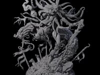 This aberration towers with otherworldly presence, its form distinguished by multiple writhing tentacles and clawed appendages that stretch outward in dynamic, swirling patterns. Multiple gaping maws crown its head, surrounded by undulating tendrils that emphasize its alien nature. The creature's aggressive, looming posture and sinuous, serpentine textures capture the essence of cosmic terror. Set upon a detailed base featuring twisted roots, scattered debris, and organic growths, this miniature creates an immediately unsettling atmosphere for any encounter.