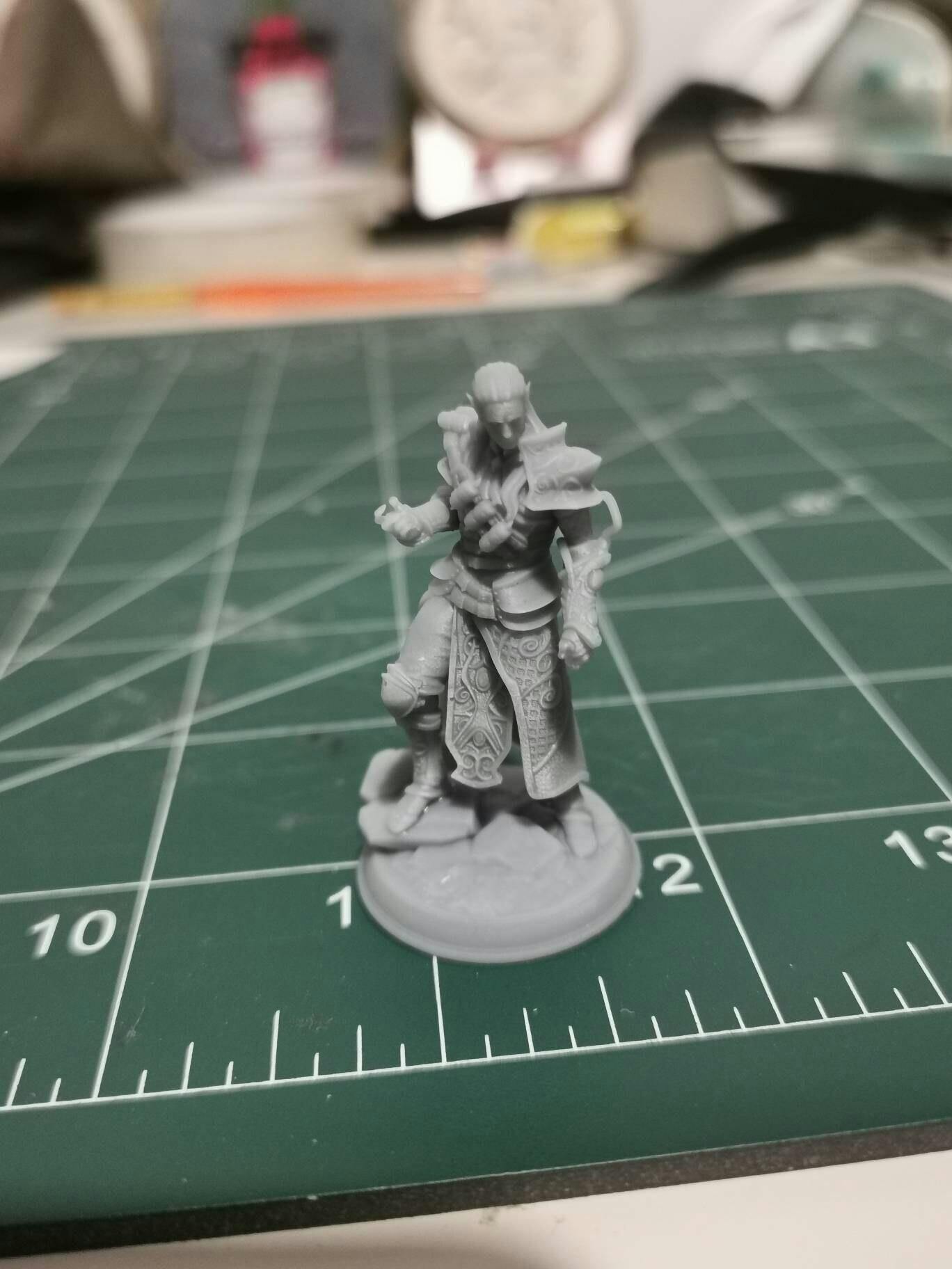 The figure’s stance, with one foot elevated on rocky terrain, gives a commanding presence, making this miniature ideal for wizards or sorcerers with an affinity for manipulating the weave of magic. The swirling designs on his robes and the angular, elegant armor speak to his elven heritage, adding depth to his character as a spellcaster deeply connected to the ancient and powerful forces of the arcane. Whether he's harnessing energy from magical sources or channeling it into powerful attacks, this figure brings gravitas to any encounter.
