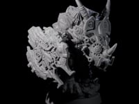 This remarkable humanoid miniature showcases extensive armor plating with intricate geometric patterns, featuring distinctive layered shoulder guards and a commanding facial helm crowned by two sweeping horns. The mechanical-precise detailing extends across the entire figure, while the circular central motif on the helm draws focus to its distinctive silhouette. Set upon a round base with sculpted rocky terrain, this heavily armored warrior represents a unique fusion of primal strength and tactical defense.