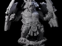 This muscular humanoid miniature captures the essence of a seasoned shield-bearer, its distinctive triple-horned head profile reminiscent of ancient reptilian ancestry. The figure's powerful stance is accentuated by detailed tribal ornamentation adorning both waist and chest, while textured scales cover strategic portions of its form. Each hand grips a massive, jagged shield slab, perfect for both defense and intimidation. The round base features natural elements including exposed tree roots and rocky terrain, creating an immersive tabletop presence.