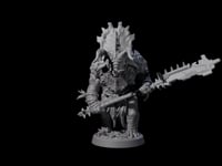 This detailed miniature captures the raw power of a muscular humanoid fighter, featuring intricate layered armor and a traditional kilt-like garment. The figure's hunched, aggressive stance perfectly complements its massive two-handed weapon with jagged edges. Notable sculpted details include prominent ridges along its back and head, creating excellent opportunities for detail work. The simplified base provides a stable foundation for this striking TTRPG character or encounter piece.