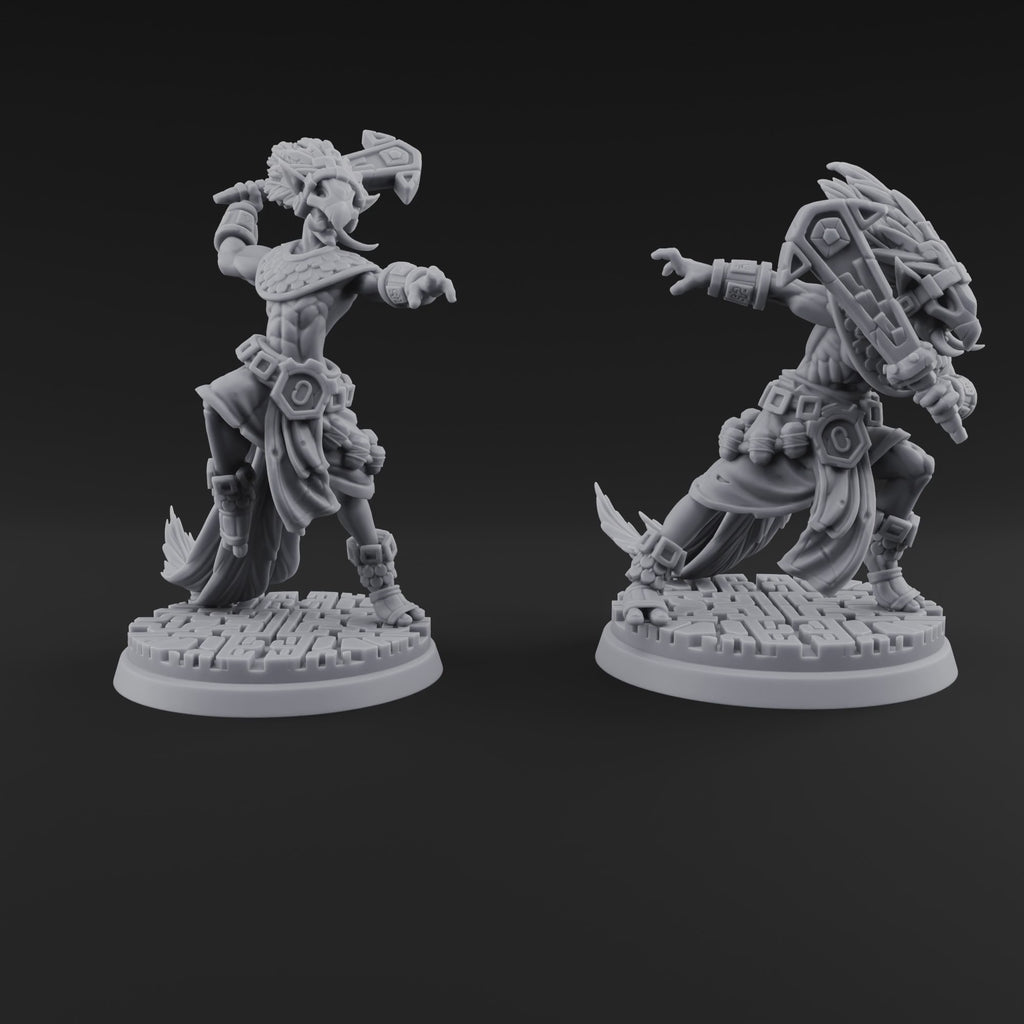 These hobgoblin melee fighters stalk across ruined stonework with predatory intent, weapons drawn and eyes locked on their next target. Draped in ornate Aztec-inspired armor adorned with geometric glyphs and totemic carvings, each sculpt radiates a sense of disciplined savagery. One hand extends to direct allies or mark prey while the other grips a brutal war implement with white-knuckle purpose. The razor-sharp detail on every buckle, pouch, and feathered crest gives this pair an imposing tabletop presence that demands attention.