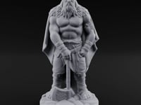 This broad-shouldered barbarian grips the haft of a decorated war axe planted firmly between his feet, exuding quiet menace and battle-hardened patience. A horned helm crowns his brow above a wild, braided beard, while a heavy cloak drapes from massive shoulders over a bare, muscular torso. Wrapped leather bracers, fur-trimmed boots, and a rope-cinched loincloth complete the look of a raider who answers to no king.