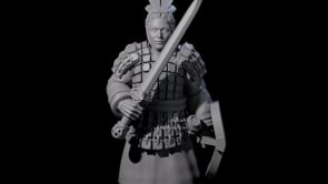 This stoic warrior embodies the disciplined might of ancient imperial armies. Clad in layered lamellar armor with scaled shoulder protection, he grips a straight sword while bearing a shield marked with military insignia. His topknot and stern expression speak of unwavering loyalty and battlefield experience. Perfect for eastern-inspired campaigns or as an elite temple guardian.