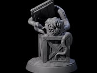 This young shoggoth writhes within a weathered wooden crate, its malleable form already displaying the characteristic tentacles and mouths of its species. Multiple eyes dot its protoplasmic surface while razor-sharp teeth hint at its voracious appetite. The creature's pose captures the moment of emergence, perfect for encounters involving forbidden experiments or eldritch discoveries.