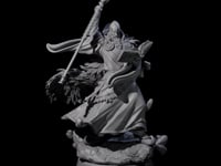 This highly detailed human archmage miniature captures the essence of mystical mastery. The figure's dynamic pose showcases intricate robes with multiple layers, complemented by practical pouches and a sturdy belt. One hand clutches an ornately designed staff while the other holds an embellished spellbook, marking the character's scholarly nature. The long beard and flowing hair add gravitas to this powerful spellcaster's presence, while the circular base features sculpted rocky terrain that elevates the dramatic presentation.