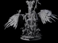 This imposing fiendish lord spreads massive feathered wings while wielding arcane power from atop an ornate infernal throne. Elaborate baroque armor adorns their form, with intricate details covering every surface from ceremonial pauldrons to ritual implements. Smaller demonic minions cluster at the base, emphasizing the creature's supreme authority over lesser devils.