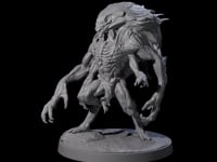 The Mutated Wyrmspawn B miniature is a striking representation of a creature that merges draconic and monstrous elements in a truly menacing form. It stands hunched with elongated limbs, each ending in sharp, claw-like fingers that accentuate its predatory and fearsome nature. The figure's textured and rugged skin, resembling hardened scales, reflects its dragon-like attributes, while the elongated, serpentine head adorned with bony ridges or spikes speaks to its draconic lineage. This miniature's open mouth, lined with rows of pointed teeth, adds to its intimidating appearance, making it a standout piece for any collection.
