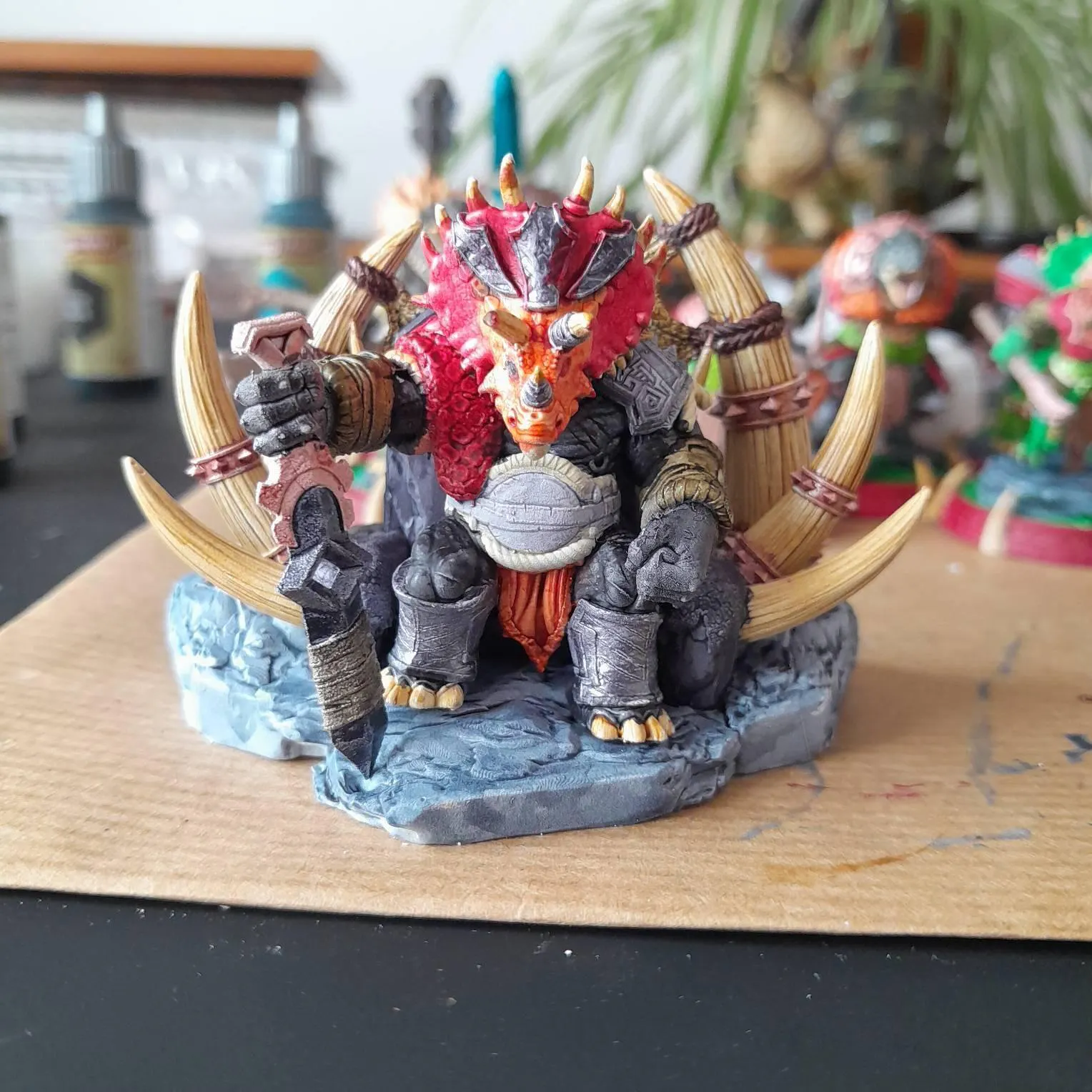 Behold the Stoic Saurian King, a stunning and commanding miniature that captures the essence of regality and power. This 75mm masterpiece showcases a reptilian humanoid seated majestically upon a throne crafted from bones and intricately carved stones. With its scaly skin, pronounced horns, and jagged ridges, the Saurian King exudes a fearsome presence, further emphasized by its deep-set eyes and stoic expression. The carefully sculpted details highlight the raw textures of its saurian nature, making it a captivating centerpiece for any tabletop collection.