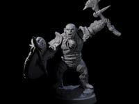This expertly detailed humanoid miniature captures the essence of orcish might, featuring pronounced musculature beneath minimal layered armor and belted garments. The dynamic pose shows the warrior mid-strike, wielding a formidable double-bladed axe while maintaining a defensive stance with a rugged, spiked shield. The face sculpt demonstrates characteristic orcish features with bared fangs and an intimidating war cry. Set upon a detailed circular base with uneven terrain, this figure promises to be an impressive addition to any tabletop battlefield or display shelf.