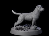 This stalwart guard dog stands alert with ears perked and tail raised, scanning for threats. Muscular shoulders and powerful haunches speak to years of faithful service protecting settlements, caravans, or adventuring parties. The noble beast's unwavering gaze promises fierce loyalty to those under its protection.