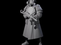 This weathered commando grips his submachine gun with practiced readiness, his long coat billowing around armored gear. Gas mask and tactical goggles suggest operations in hostile environments, while his sturdy boots and battle-worn equipment speak to countless missions behind enemy lines. His alert stance captures the tension of a soldier ready for close-quarters combat.
