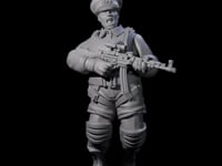 This seasoned soldier stands in a confident combat stance, assault rifle at the ready. His military cap and tactical gear mark him as professional infantry, while knee pads and sturdy boots show he's prepared for any terrain. The determined expression and ready posture suggest a veteran who's seen action and emerged stronger.