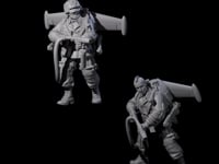 These elite jetpack troopers represent the pinnacle of military innovation, combining aerial mobility with devastating firepower. Each soldier bears distinctive gear including advanced jetpack propulsion systems and military-grade flamethrowers. One trooper features tactical goggles and combat harness while the other displays determined focus beneath their flight helmet. Perfect for weird war campaigns, alternate history scenarios, and futuristic military encounters.