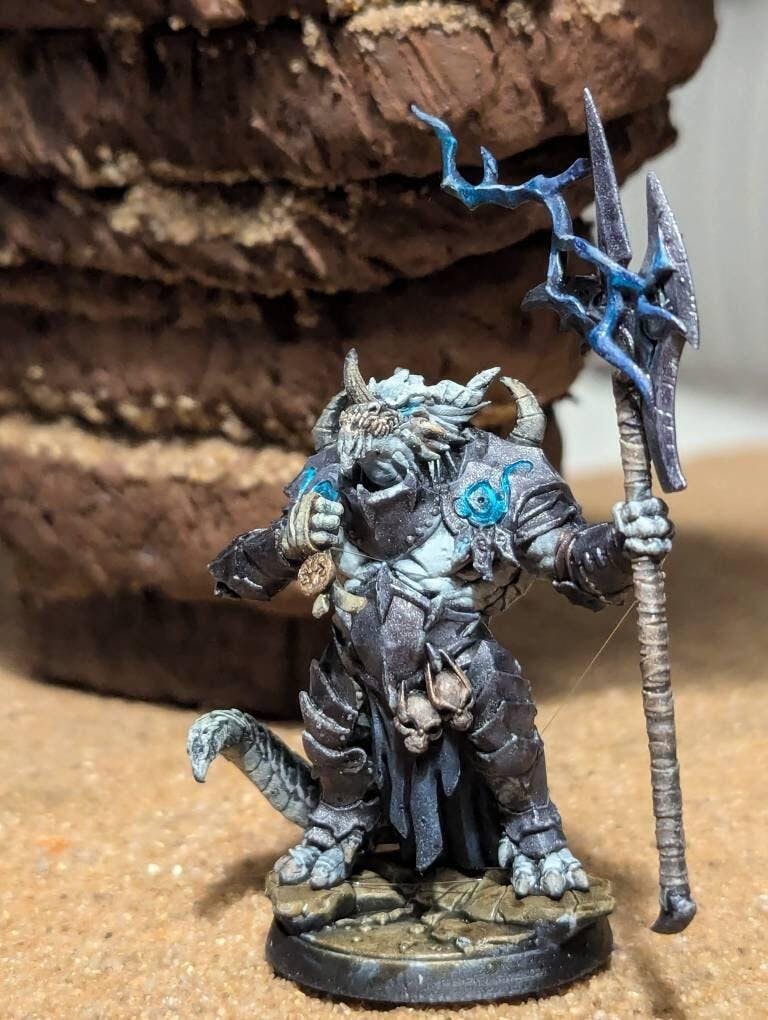 The sculpture of this Dragonborn General captures his proud stance and regal bearing. The heavy armor is intricately detailed, reflecting his high status and the protective needs of combat. Each scale and plate is crafted to not only offer defense but also to impress and intimidate. The lance he carries is both a weapon and a symbol of his command, designed with ornate features that denote his leadership and valor. His wings, powerful and majestic, add a dynamic aspect to his figure, suggesting his capability to oversee and participate in battle from multiple dimensions.