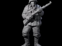 This seasoned rifleman moves forward with practiced precision, his bolt-action rifle held at the ready. Clad in field uniform and steel helmet, his tactical gear and disciplined stance speak to countless engagements. His weathered face shows the grim resolve of a veteran who has seen the worst of warfare yet continues to press forward into danger.