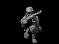 Crouched in a tactical firing position, this battle-hardened rifleman exemplifies military precision and discipline. His steel helmet shadows determined eyes as he brings his rifle to bear with practiced efficiency. Every detail from his field gear to his alert posture speaks of a seasoned warrior ready for the next engagement.